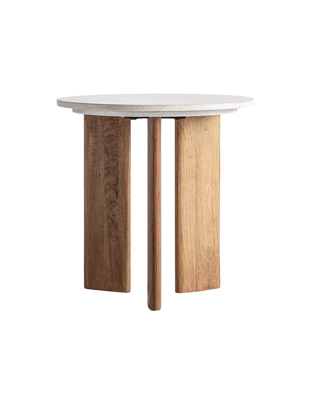 Mesa auxiliar arlanc, en color marrón/blanco, de estilo contemporáneo. Fabricado en madera de mango, combinado con terrazo.