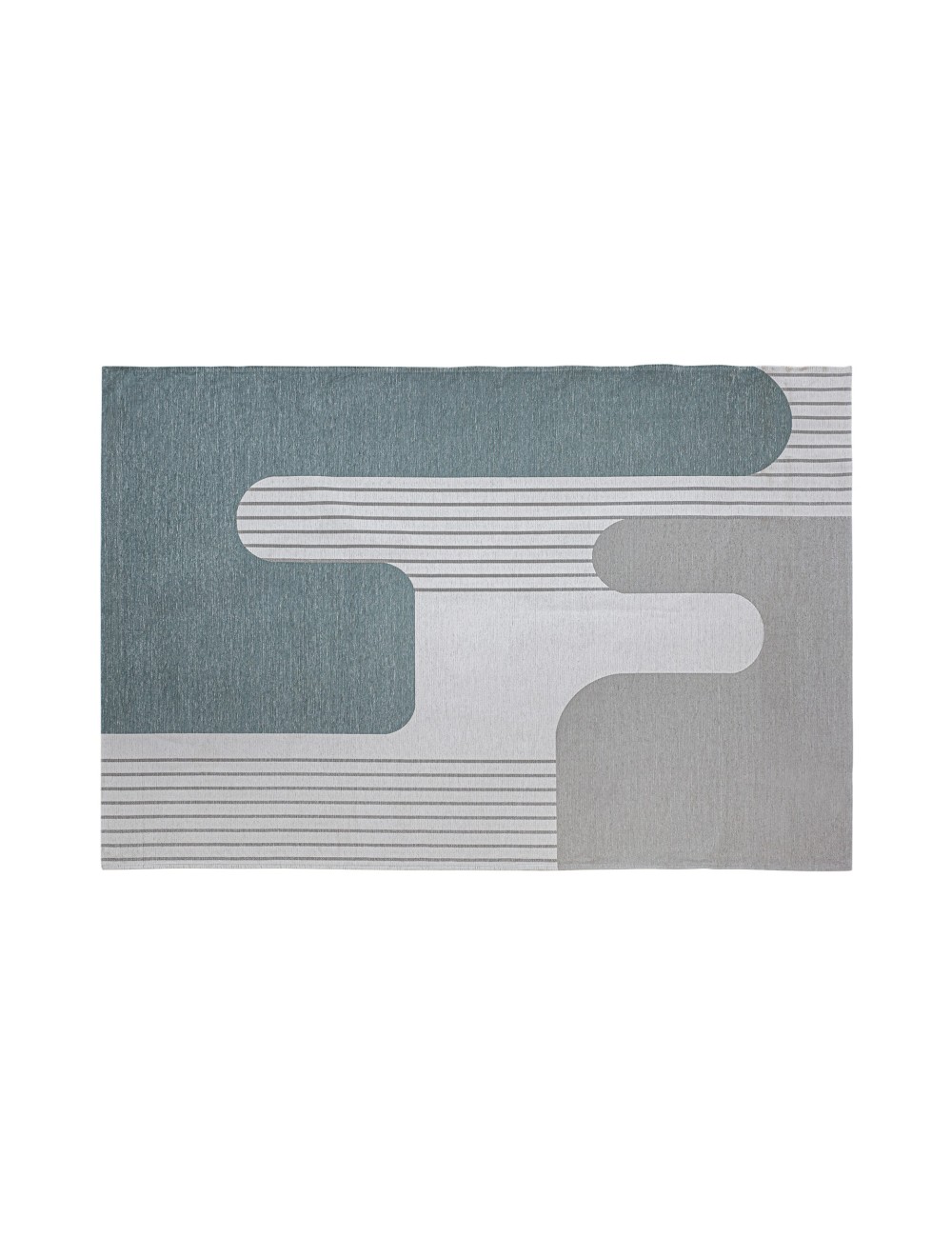 Alfombra lucia, en color tonos de azul, de estilo contemporáneo. Fabricado en poliéster, combinado con algodón y viscosa.