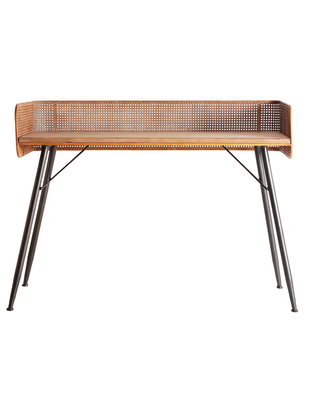 Escritorio rectangular tirkane, en color marrón, de estilo contemporáneo. Fabricado en hierro, combinado con madera de abeto. Producto desmontable.