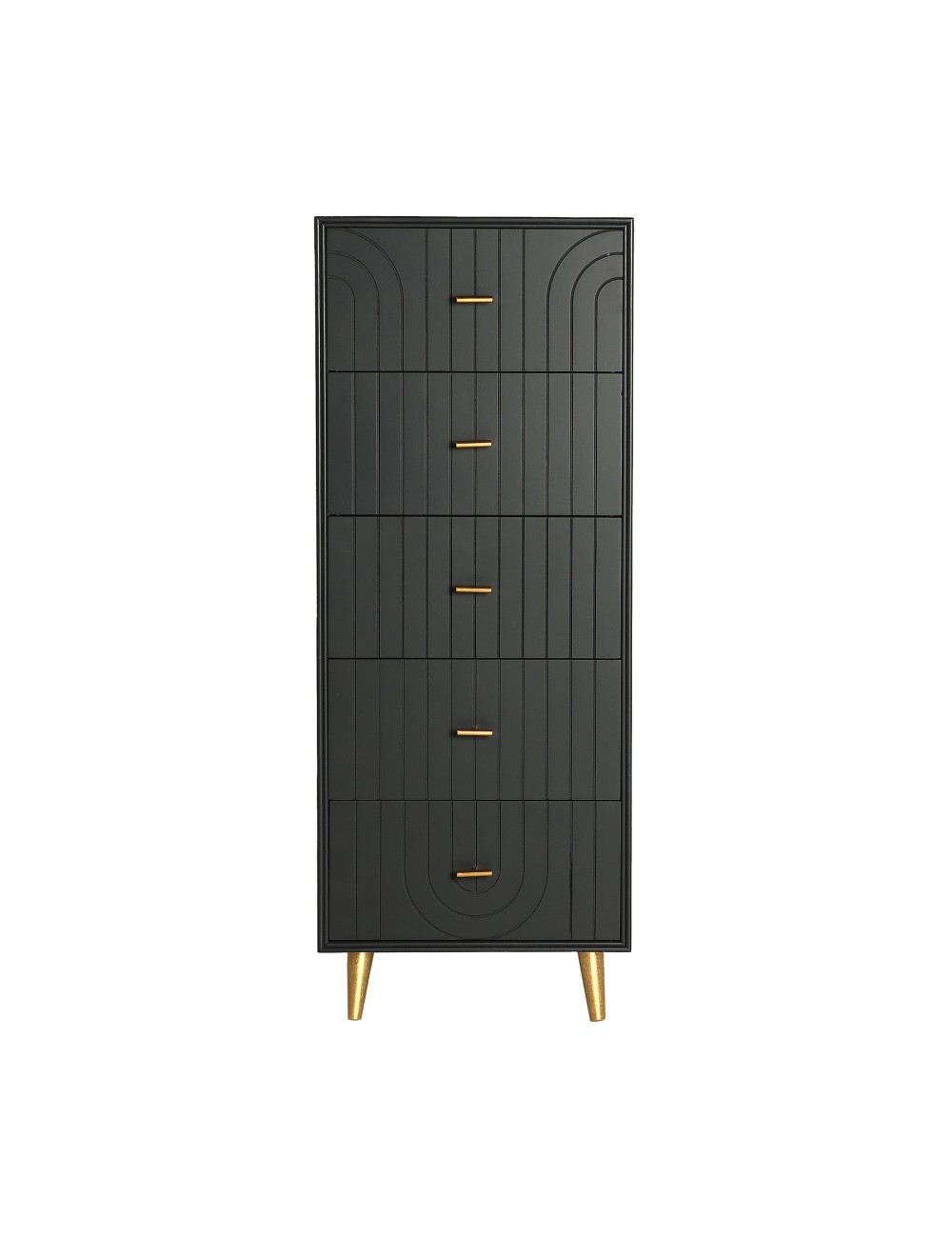 El Sinfonier Tremes es una pieza de estilo Art Deco que combina elegancia y funcionalidad. Fabricado en madera DM con detalles en hierro, presenta un acabado en color gris oscuro con acentos dorados, aportando un toque sofisticado a cualquier dormitorio o vestidor.