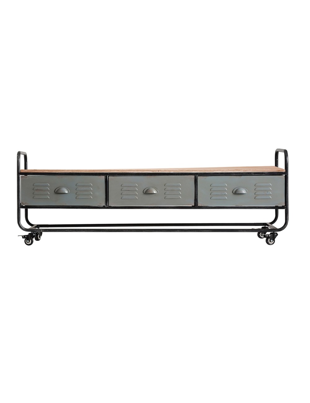 El Mueble de TV Ostrava es una pieza de estilo industrial que combina hierro en tonos gris y negro con madera de abeto, evocando la estética de las antiguas taquillas industriales. Sus dimensiones son 150 cm de ancho, 40 cm de fondo y 53 cm de alto. Cuenta con tres cajones y una balda inferior sostenida por cuatro pequeñas ruedas, ofreciendo tanto funcionalidad como un diseño distintivo.