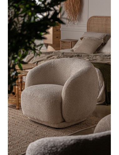 Sillón redondo bouclé privas, en color crema, de estilo art deco. Fabricado en algodón bouclé, combinado con madera dm. |