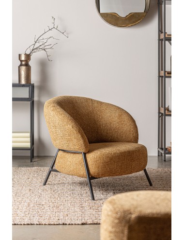 Sillón redondo souvens, en color ocre, de estilo vintage. Fabricado en poliéster, combinado con madera dm y hierro.
