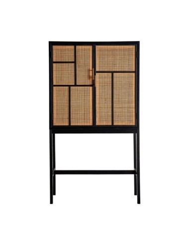 Armario rectangular beilen de estilo nórdico, fabricado en madera de pino en color negro, combinado con madera dm en color natural y ratán en color marrón claro. Producto desmontable.