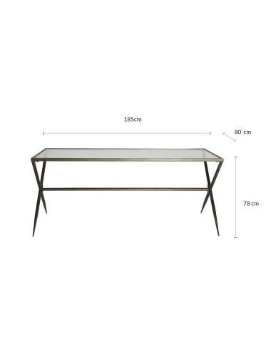 La Mesa de Comedor Alles es una pieza de estilo industrial que combina una estructura de hierro en color negro con un tablero de vidrio semi-transparente. Sus dimensiones son 185 cm de largo, 80 cm de ancho y 78 cm de alto, lo que la hace adecuada para acomodar hasta ocho comensales.
