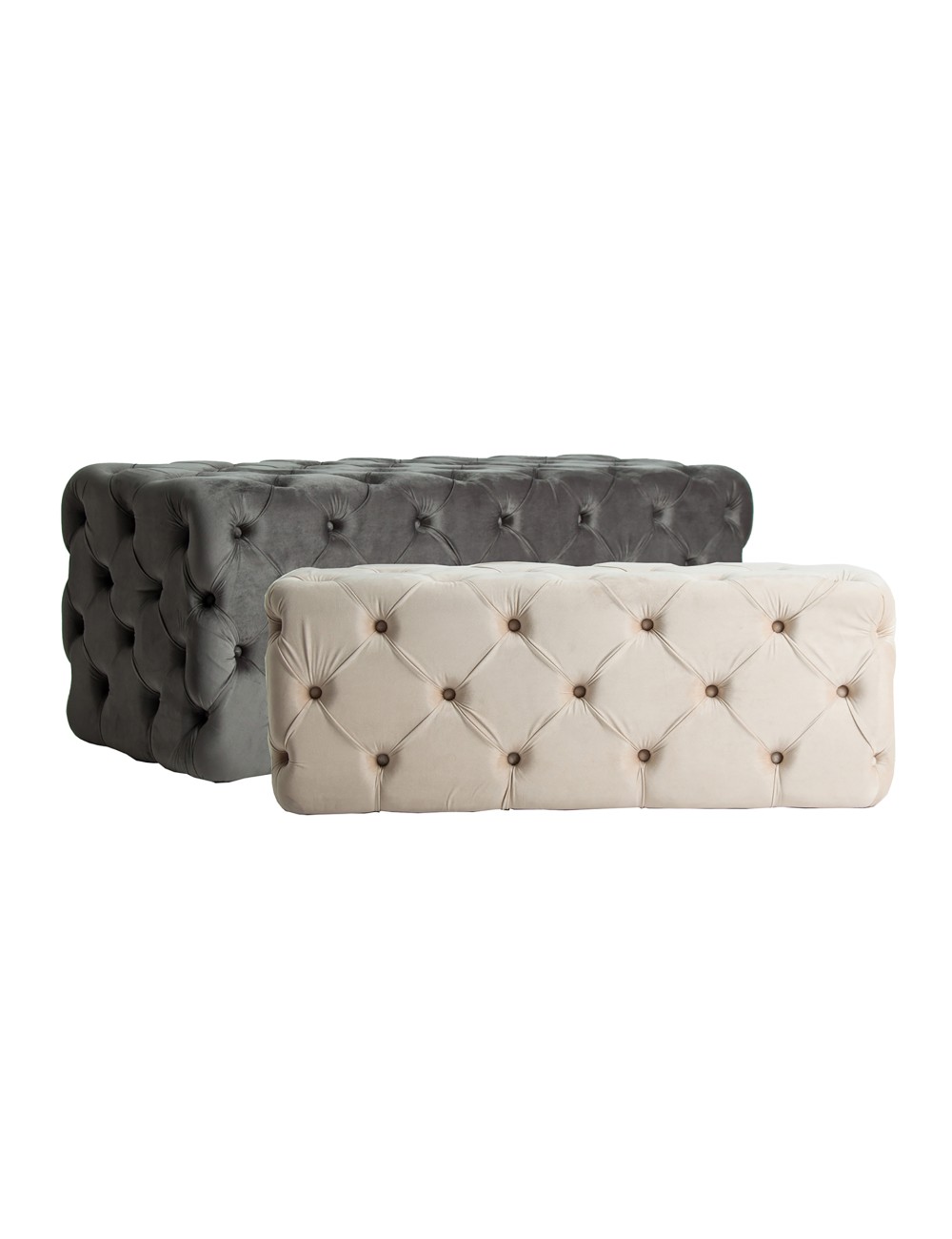 Pie de cama j/2 rectangular kalloni, en color gris/crema, de estilo vintage. Fabricado en madera dm, combinado con terciopelo y espuma.