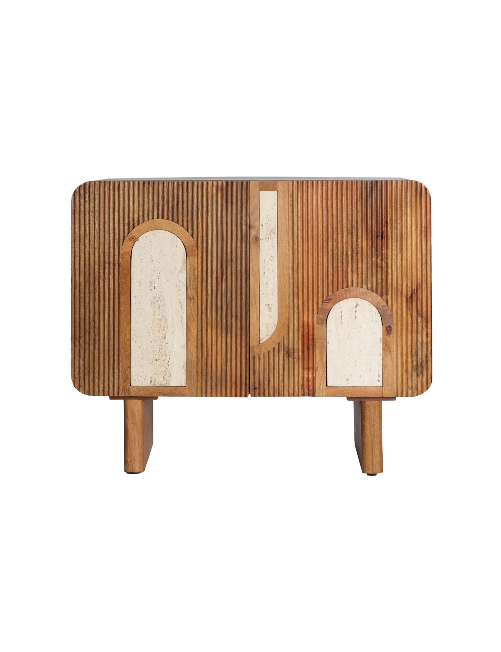 Aparador claux, en color marrón/blanco, de estilo contemporáneo. Fabricado en madera de mango, combinado con travertino y madera dm.