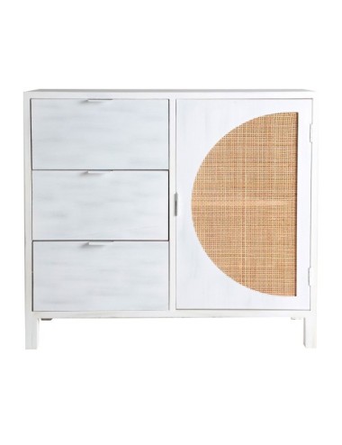 Cómoda cuadrada zemne de estilo nórdico, fabricado en madera de pino en color blanco con acabado decapado, combinado con ratán en color natural y madera dm.
