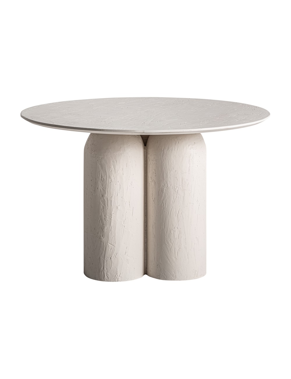 Mesa comedor redonda inha, en color blanco roto, de estilo contemporáneo. Fabricado en madera de mango.