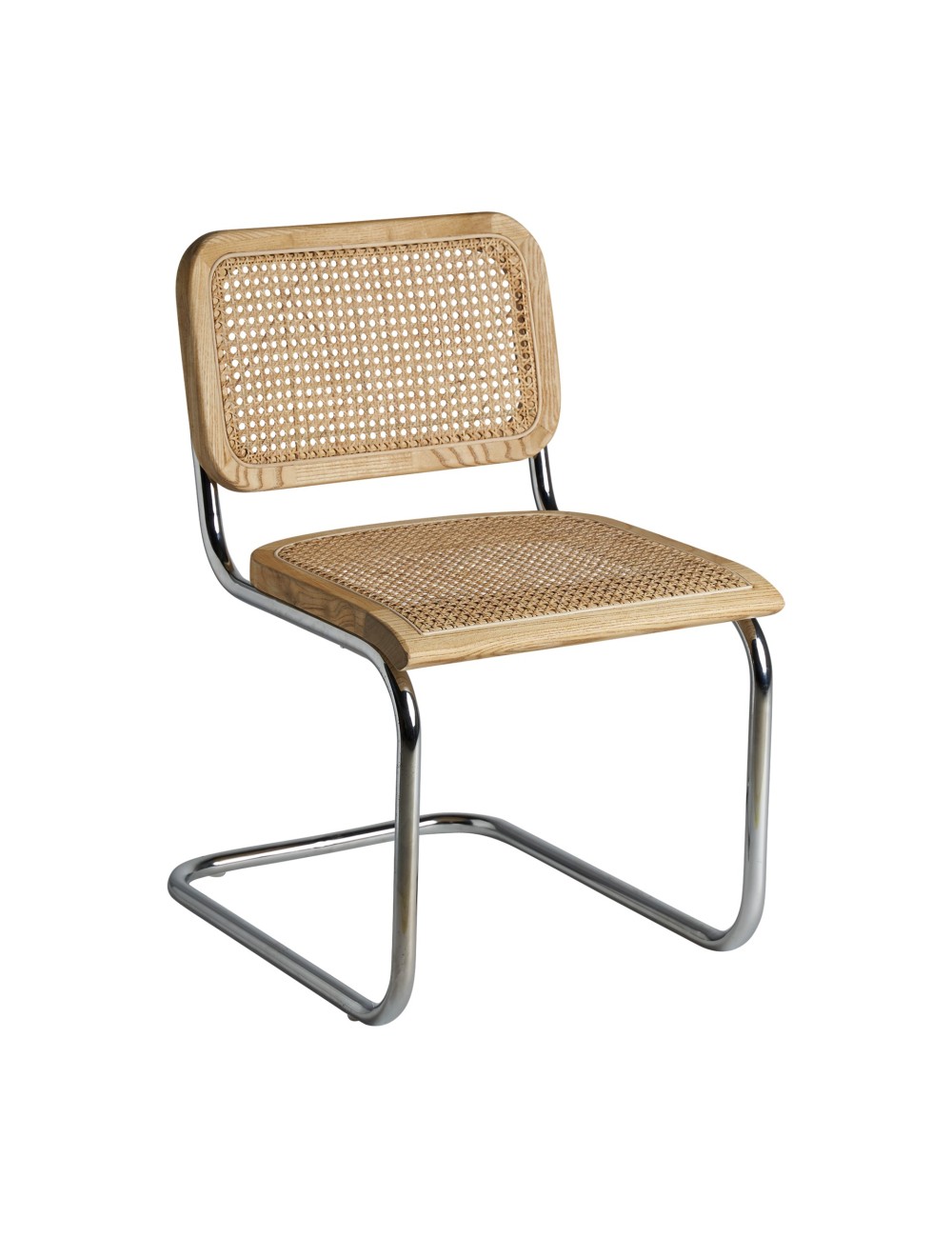 Silla sins, en color marrón, de estilo contemporáneo. Fabricado en madera de olmo, combinado con ratán y acero. Producto desmontable.