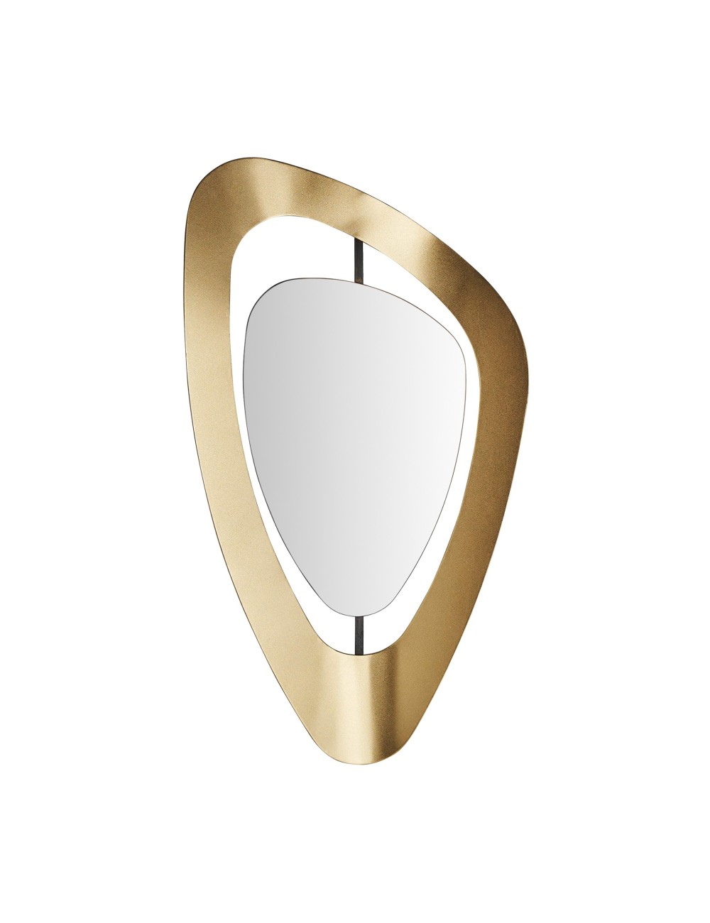 Espejo berila, en color oro, de estilo art deco. Fabricado en cristal, combinado con hierro y madera dm.