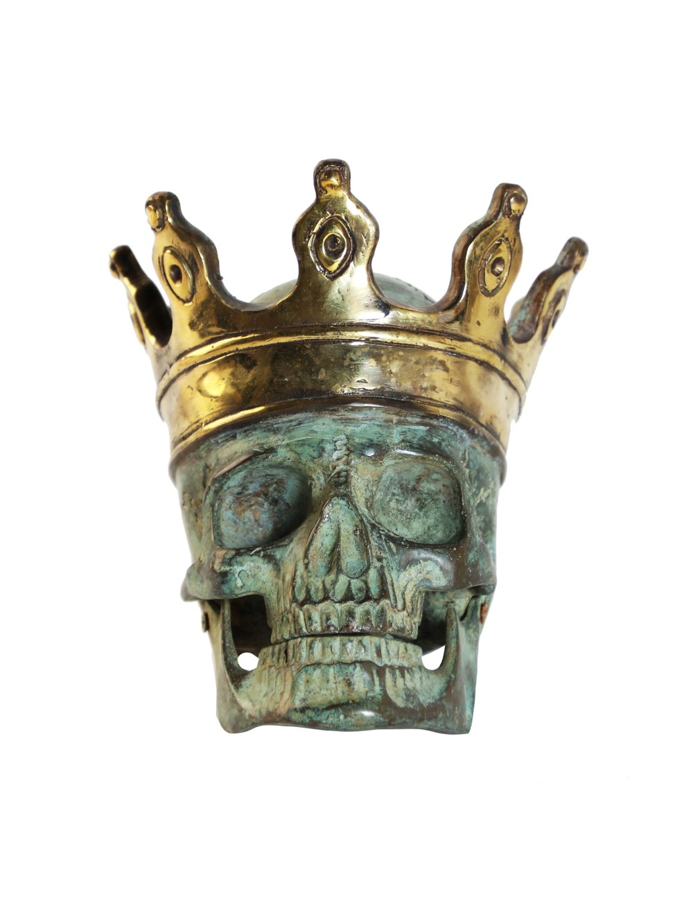 Calavera, en color verde/oro, de estilo art deco. Fabricado en bronce.