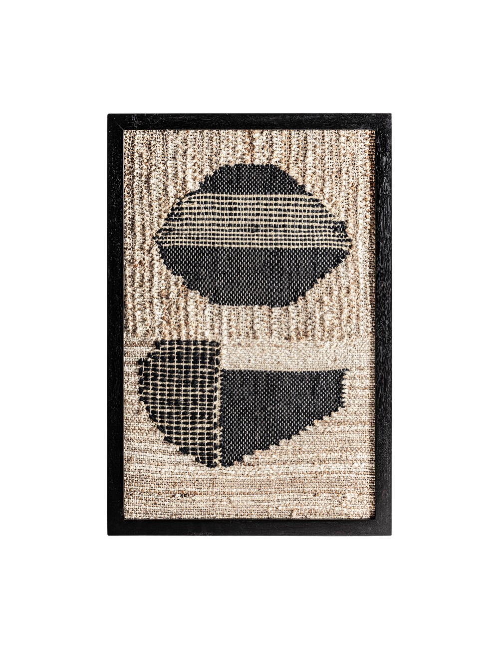 Cuadro celso, en color tonos oscuros artesanal, de estilo contemporáneo. Fabricado en madera de mango, combinado con yute y algodón.