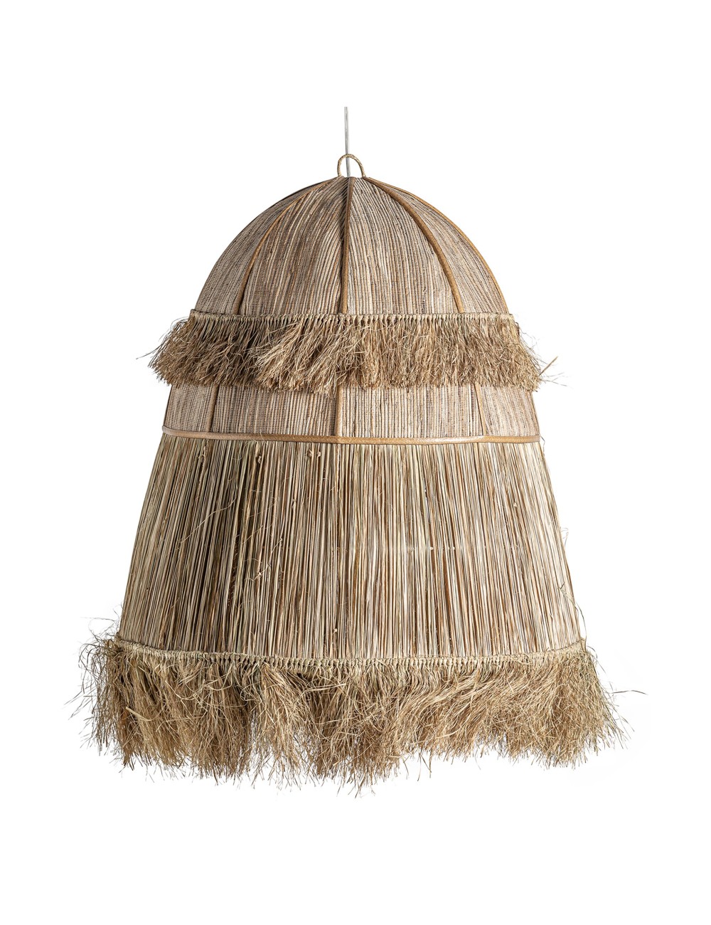 Lámpara de colgar, en color marrón, de estilo boho. Fabricado en madera de coco, combinado con fibra natural.