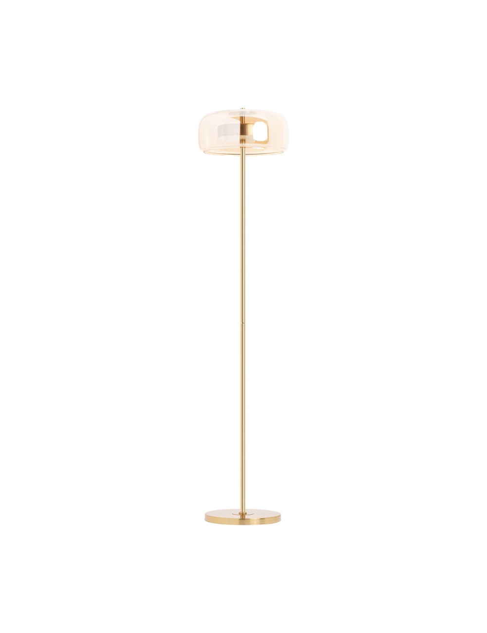 Lámpara de pie leslia, en color oro, de estilo art deco. Fabricado en hierro, combinado con acrílico y cristal.