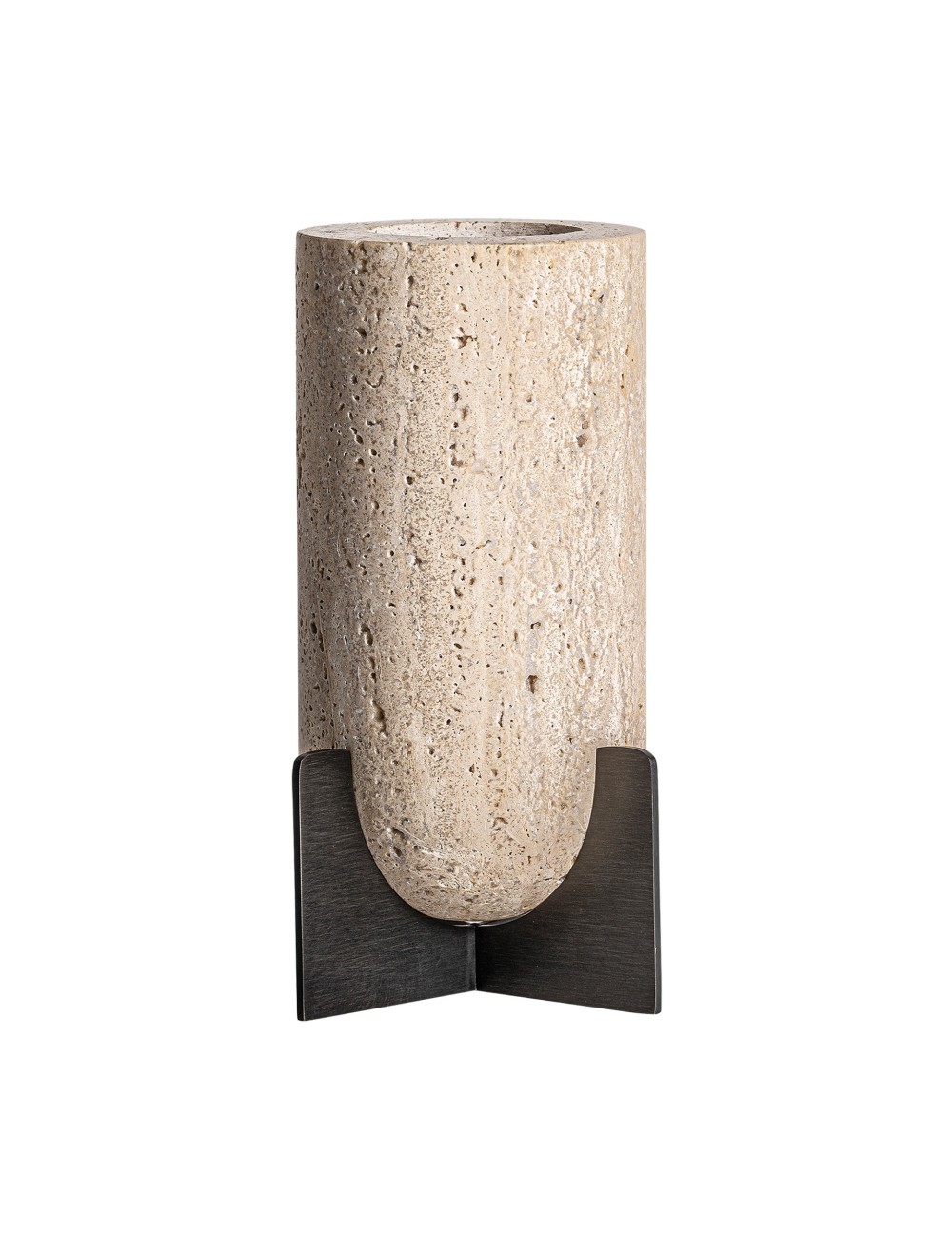 Portavela asher, en color beige, de estilo art deco. Fabricado en travertino, combinado con hierro. Producto desmontable.