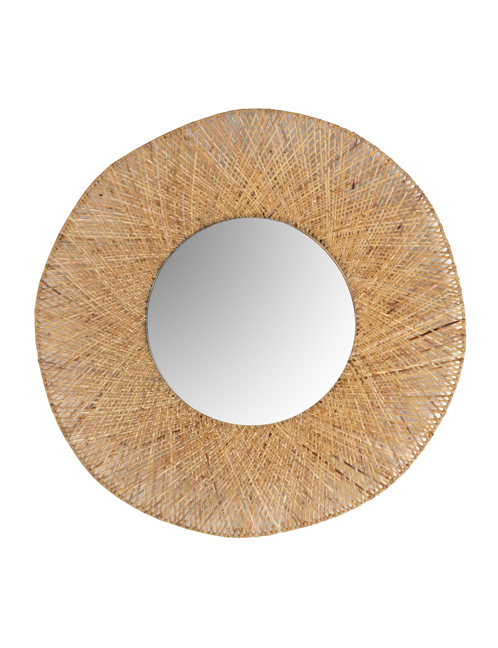 Espejo redondo, en color marrón, de estilo contemporáneo. Fabricado en ratán, combinado con espejo y espejo.