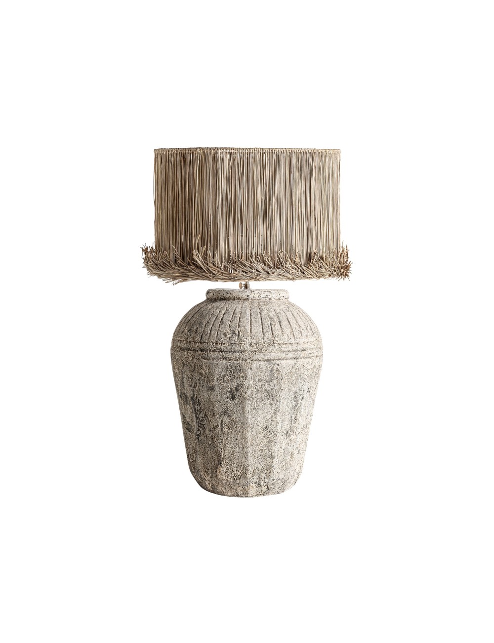 Lámpara de sobremesa, en color gris envejecido, de estilo vintage. Fabricado en cerámica, combinado con yute. | Lámpara de colgar, en color blanco, de estilo étnico. Fabricado en algodón. Producto plegable. | Lámpara de colgar, en color marrón, de estilo boho. Fabricado en ratán. | Lámpara de colgar, en color marrón, de estilo boho. Fabricado en ratán. |
