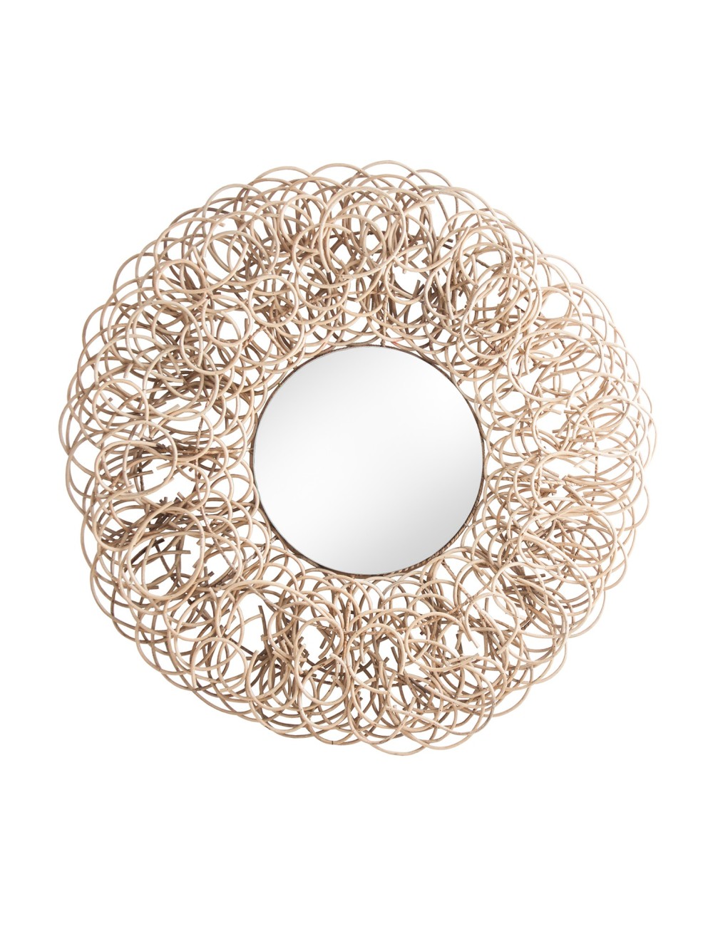 Espejo redondo, en color marrón, de estilo contemporáneo. Fabricado en ratán, combinado con espejo.