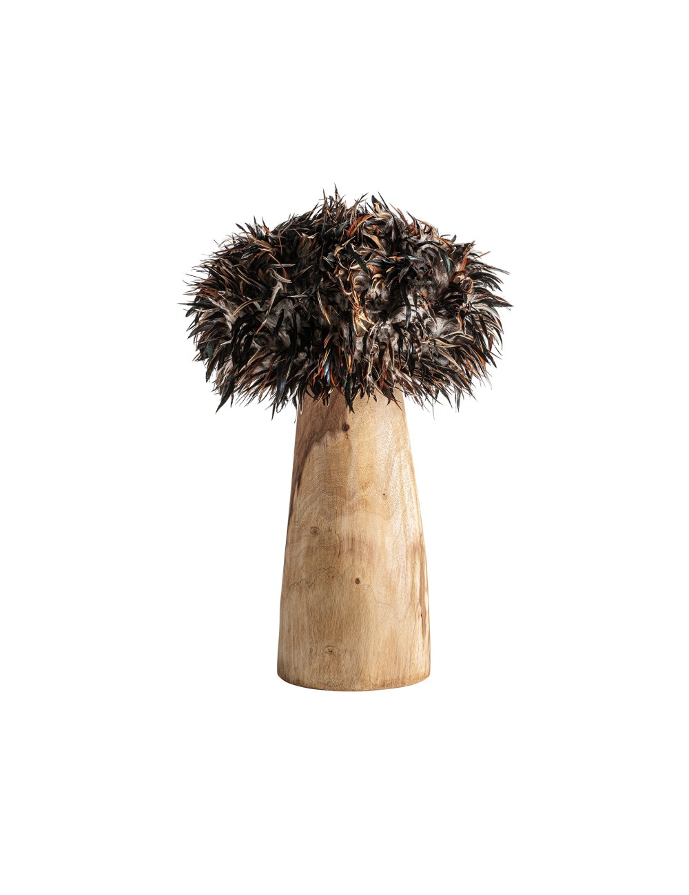 Lámpara de sobremesa ghedas, en color marrón envejecido, de estilo étnico. Fabricado en madera de teka, combinado con plumas. . Producto elevable.