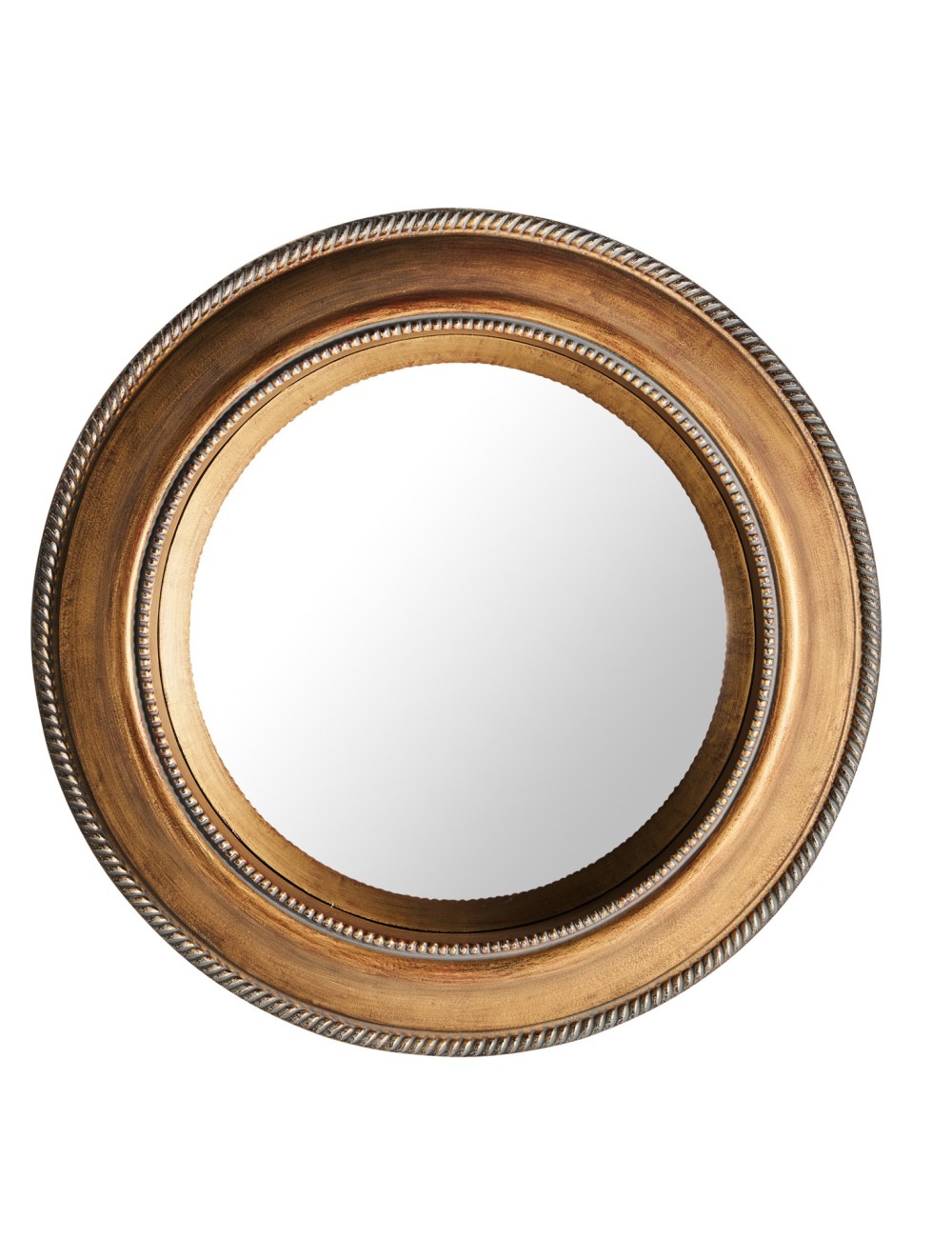 Espejo redondo almesso, en color oro viejo, de estilo art deco. Fabricado en espejo, combinado con resina.