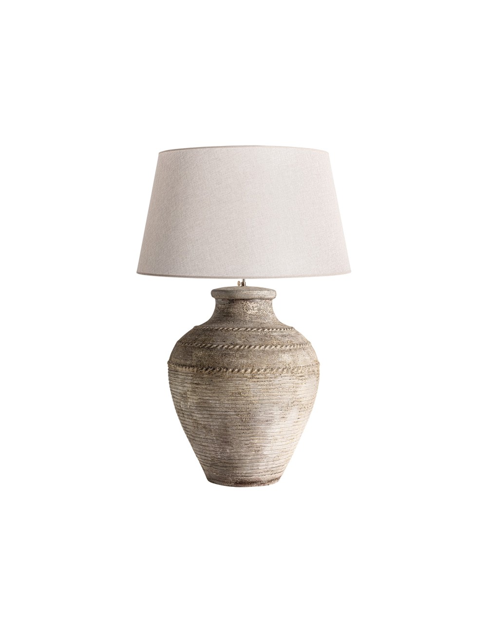 Lámpara de sobremesa, en color tonos claros envejecido, de estilo vintage. Fabricado en terracota, combinado con lino.