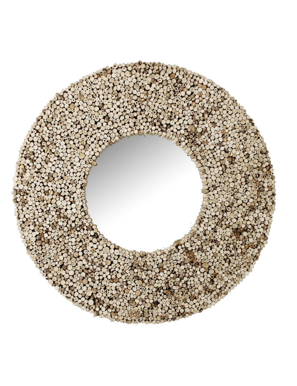 Espejo redondo maun, en color marrón, de estilo étnico. Fabricado en madera de teka, combinado con espejo.