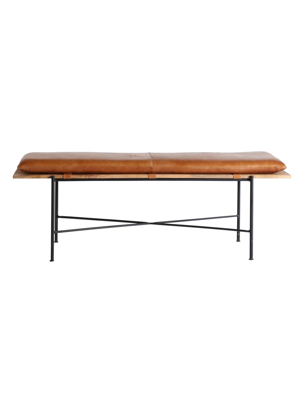 Banco dexter, en color marrón, de estilo industrial. Fabricado en hierro, combinado con cuero y madera de mango.