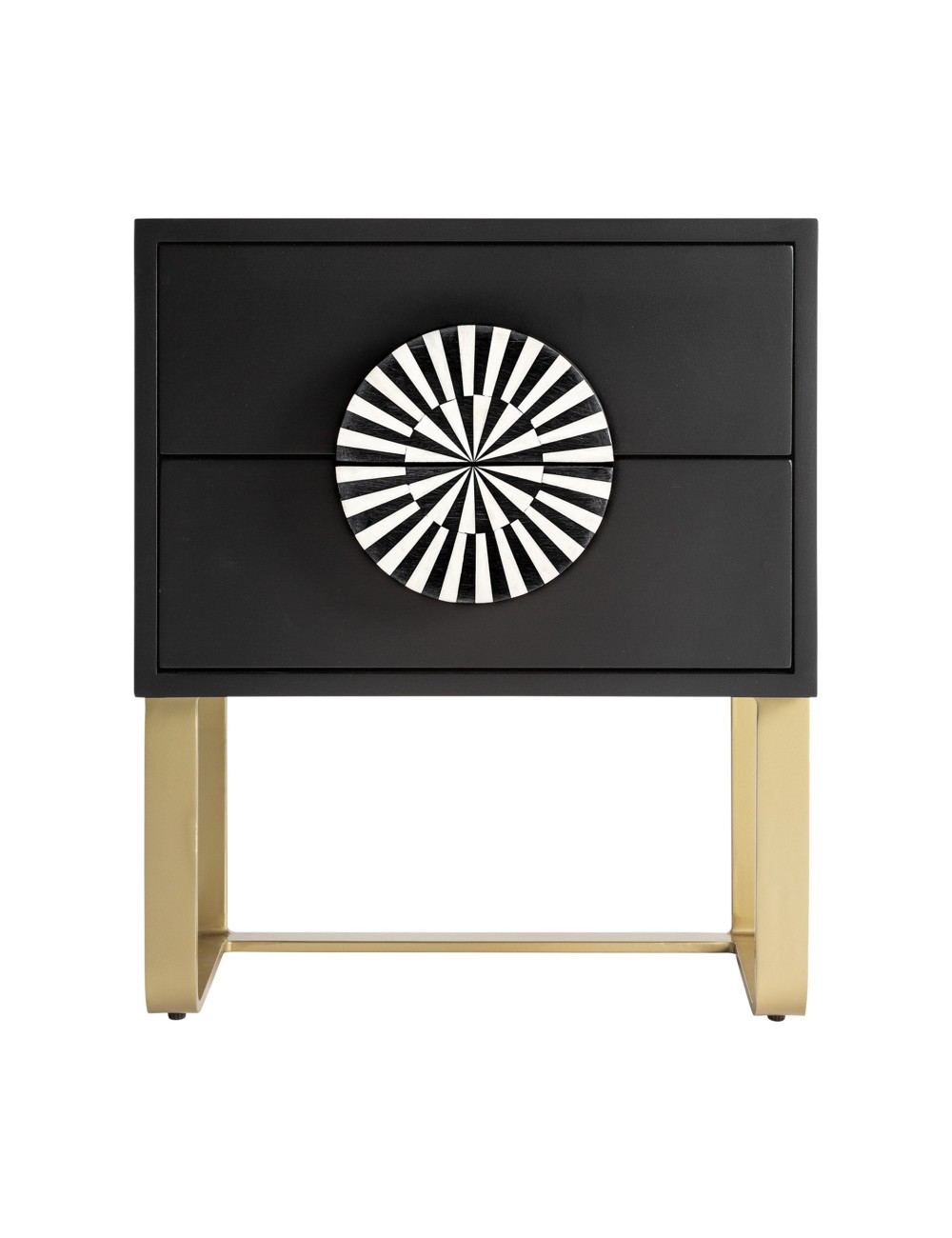 Mesita de noche gatsby, en color negro/blanco/oro, de estilo art deco. Fabricado en madera dm, combinado con hueso y hierro.