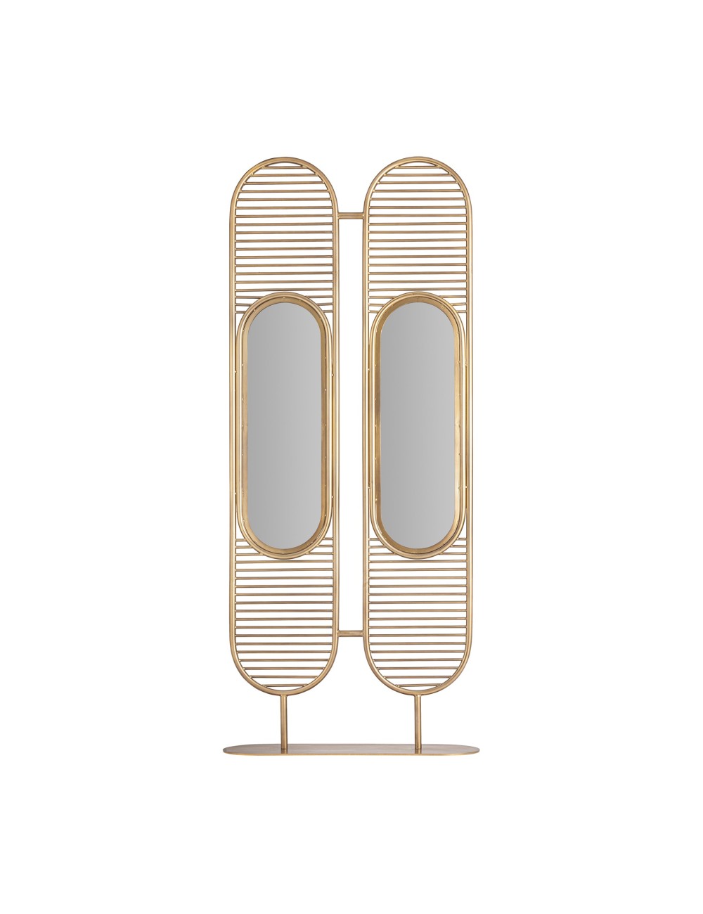 Parabán alleghe, en color oro, de estilo art deco. Fabricado en acero, combinado con cristal. Producto desmontable.