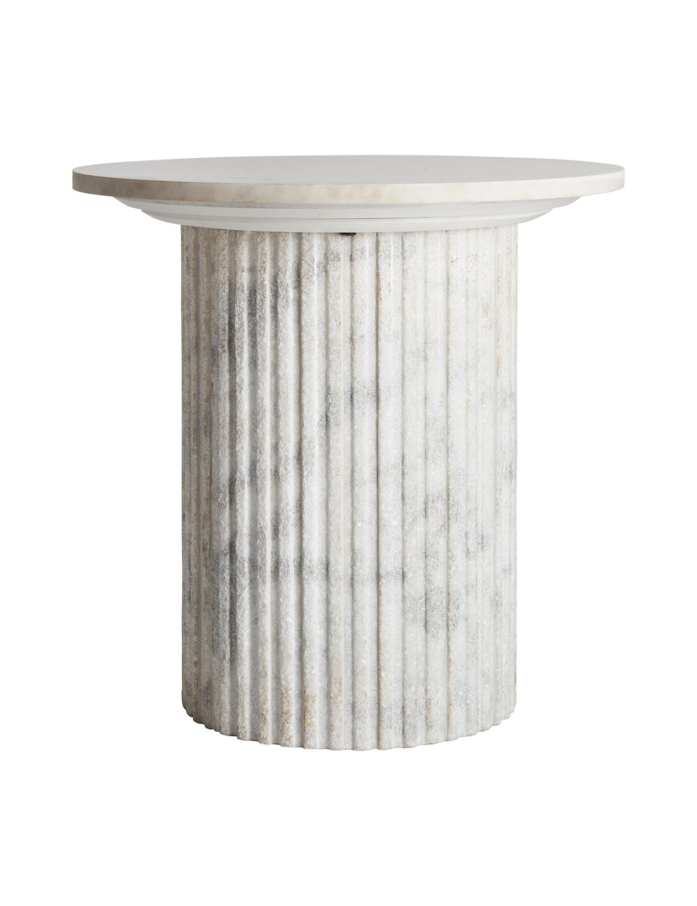 Mesa auxiliar esches, en color blanco, de estilo art deco. Fabricado en mármol. | Armario rectangular doazit, en color marrón claro, de estilo nórdico. Fabricado en madera de abeto, combinado con madera dm. Producto desmontable. |