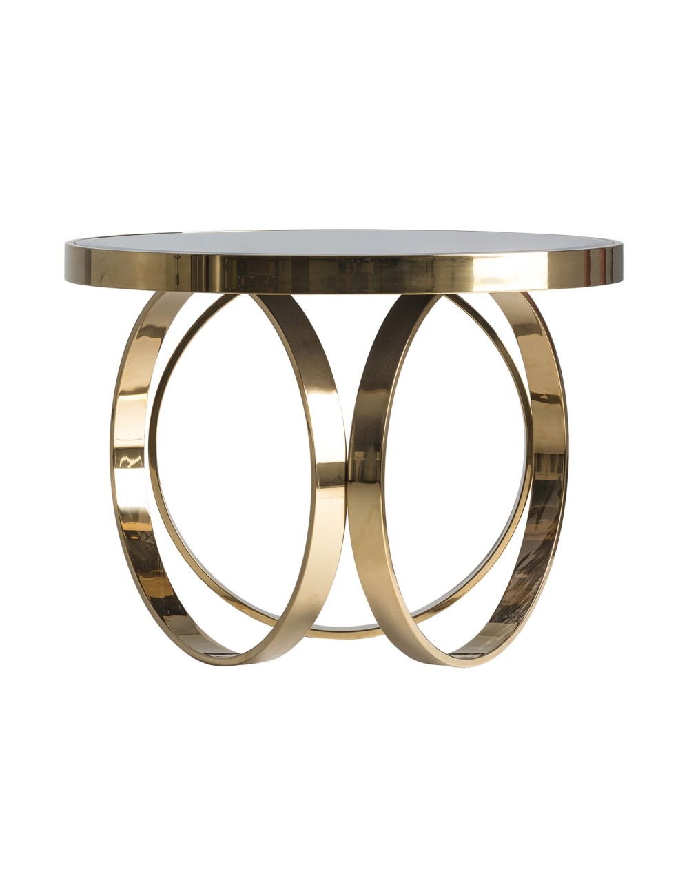 Mesa de centro reda, en color negro/oro, de estilo clásico. Fabricado en espejo, combinado con acero y vidrio. Producto desmontable.
