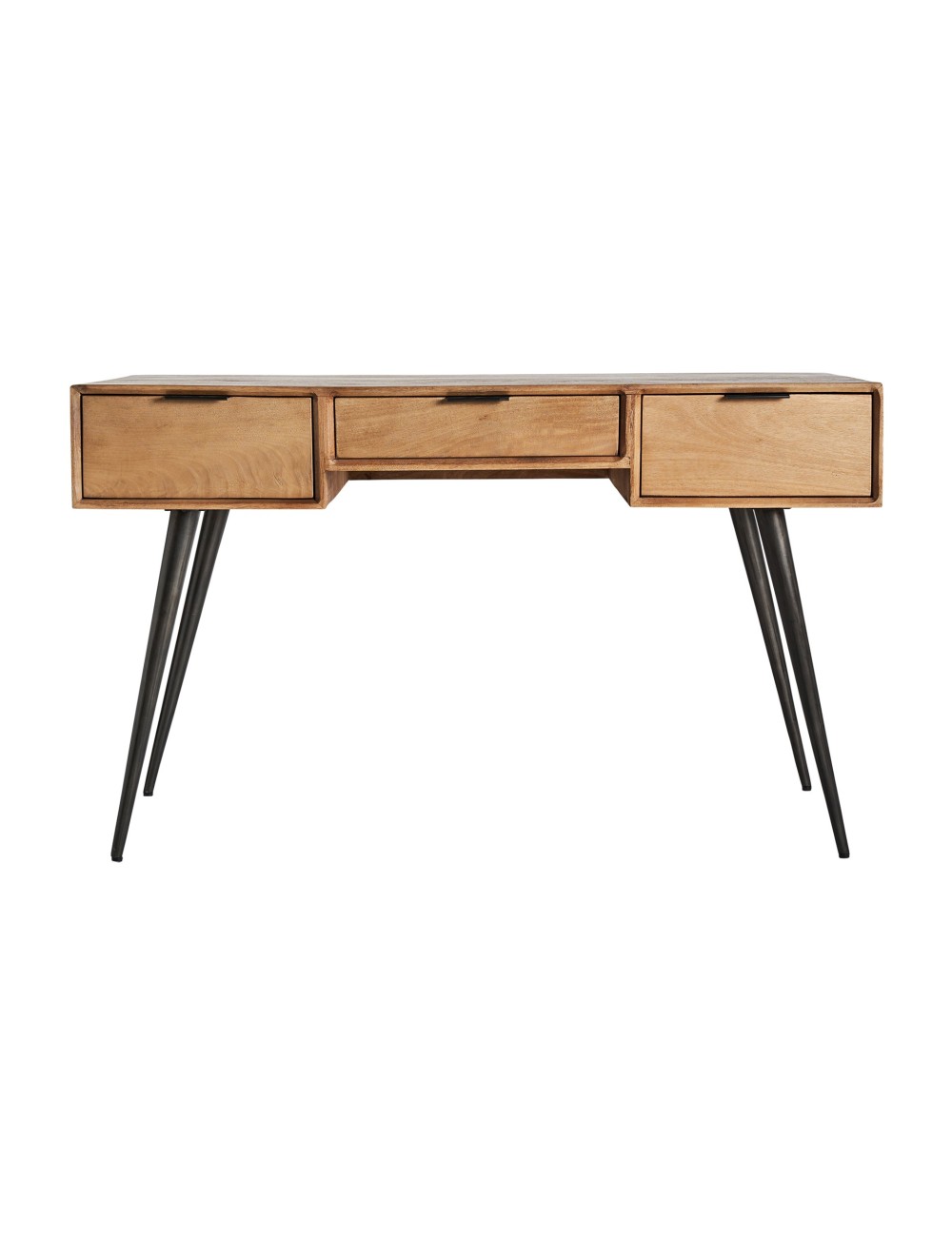 Escritorio sered, en color marrón, de estilo colonial. Fabricado en hierro, combinado con madera de mango. Producto desmontable.