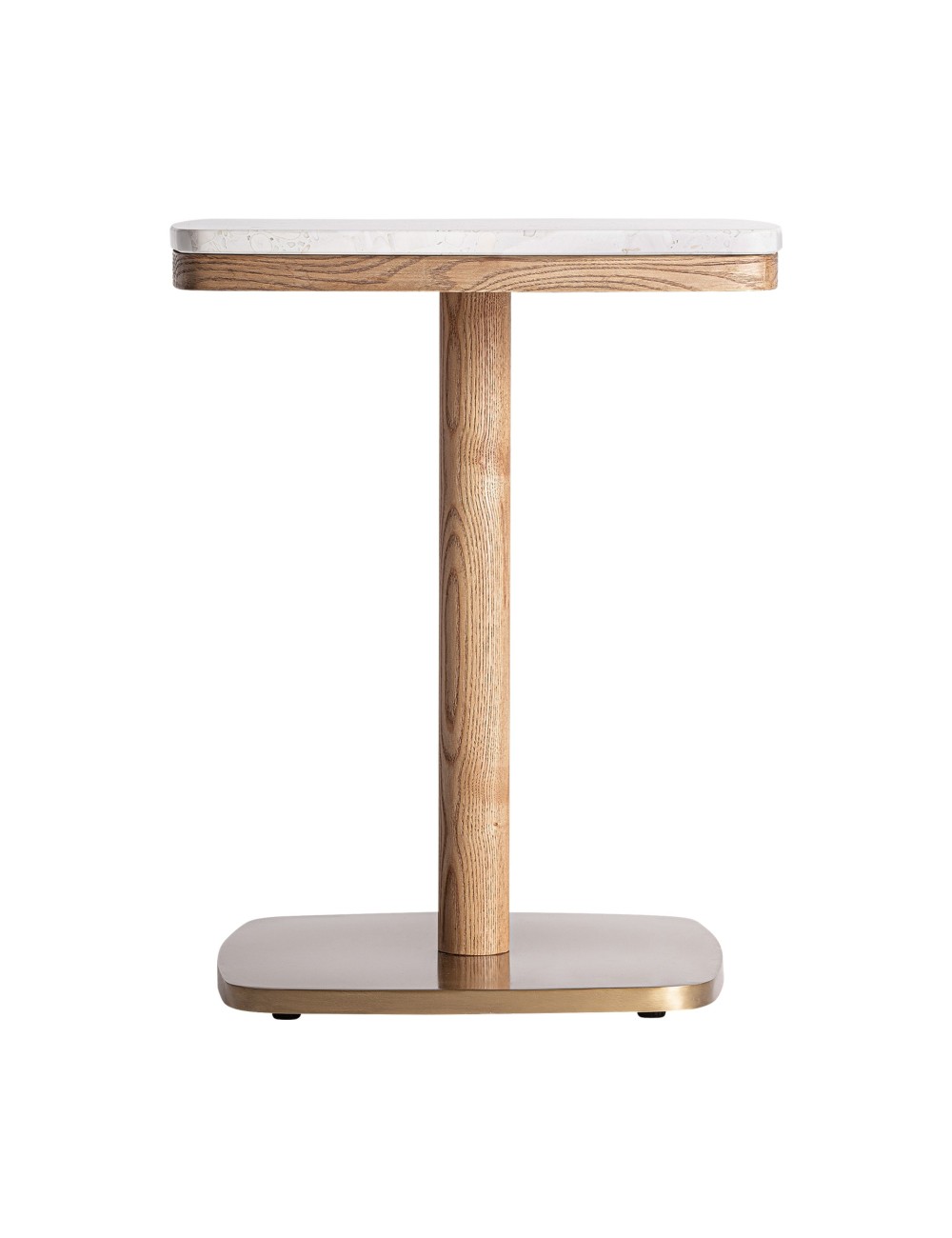 Mesa bar alferce, en color blanco/oro, de estilo art deco. Fabricado en terrazo, combinado con acero y madera.