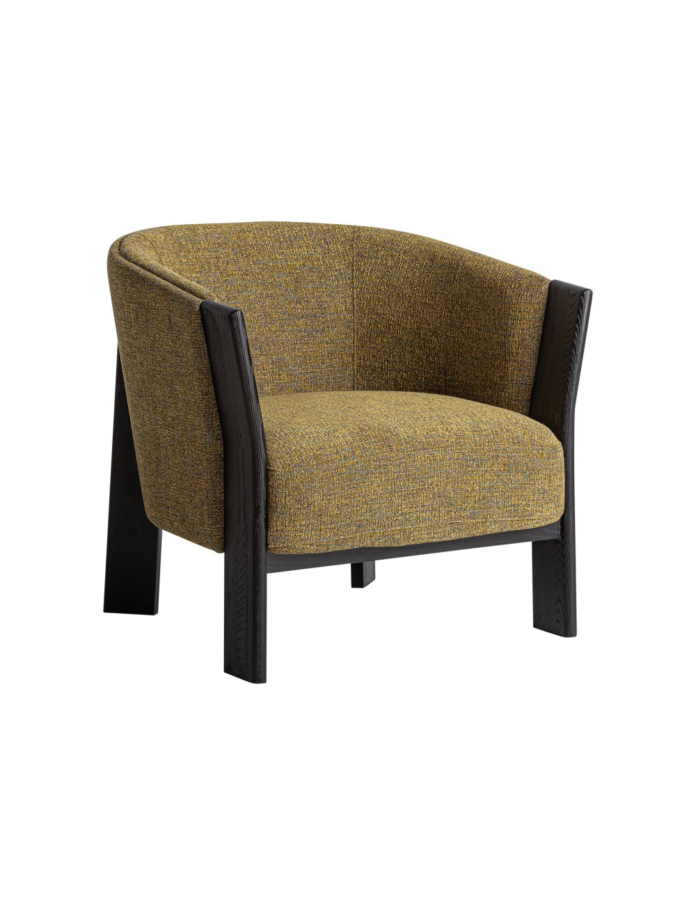 Sillón nara, en color camel, de estilo contemporáneo. Fabricado en poliéster, combinado con madera roble. |
