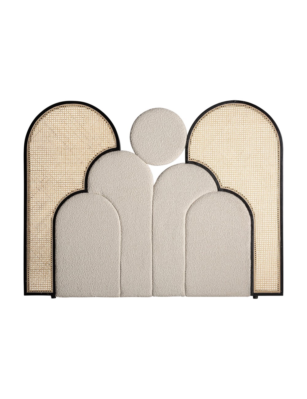 Cabezal prati bouclé, en color marrón, de estilo art deco. Fabricado en madera de pino, combinado con ratán y tela.