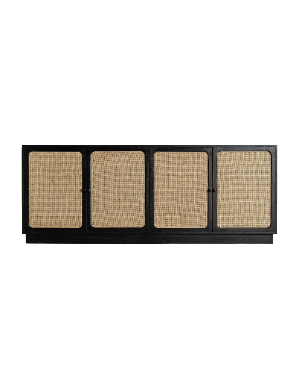 Aparador laissus, en color negro/marrón, de estilo clásico. Fabricado en madera de mango, combinado con mimbre y madera dm. | Armario athy, en color negro/blanco, de estilo contemporáneo. Fabricado en hierro. Producto desmontable. | Sillón trena, en color marrón/beige natural, de estilo boho. Fabricado en madera de teka reciclada, combinado con polipropileno reciclado y espuma. Producto desmontable, desenfundable. |