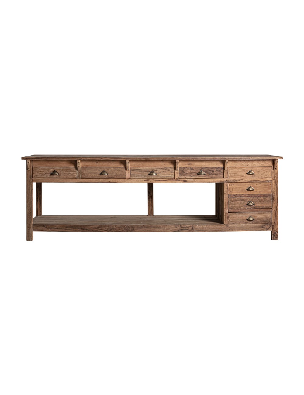 Escritorio, en color marrón, de estilo colonial. Fabricado en madera recuperada. | Sofá hebburn, en color camel, de estilo vintage. Fabricado en piel, combinado con madera de pino. Producto desmontable. |