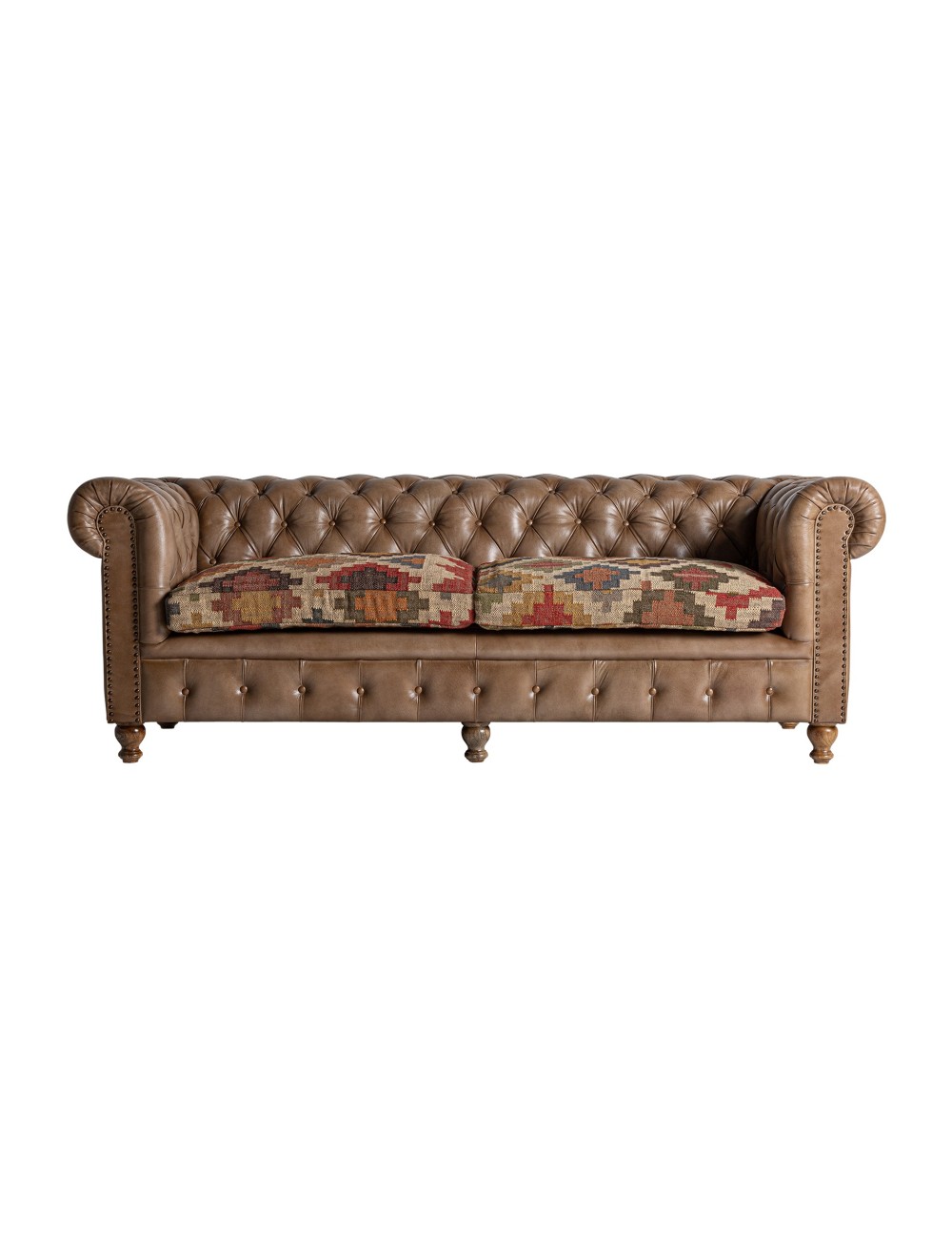 Sofá hebburn, en color camel, de estilo vintage. Fabricado en piel, combinado con madera de pino. Producto desmontable.