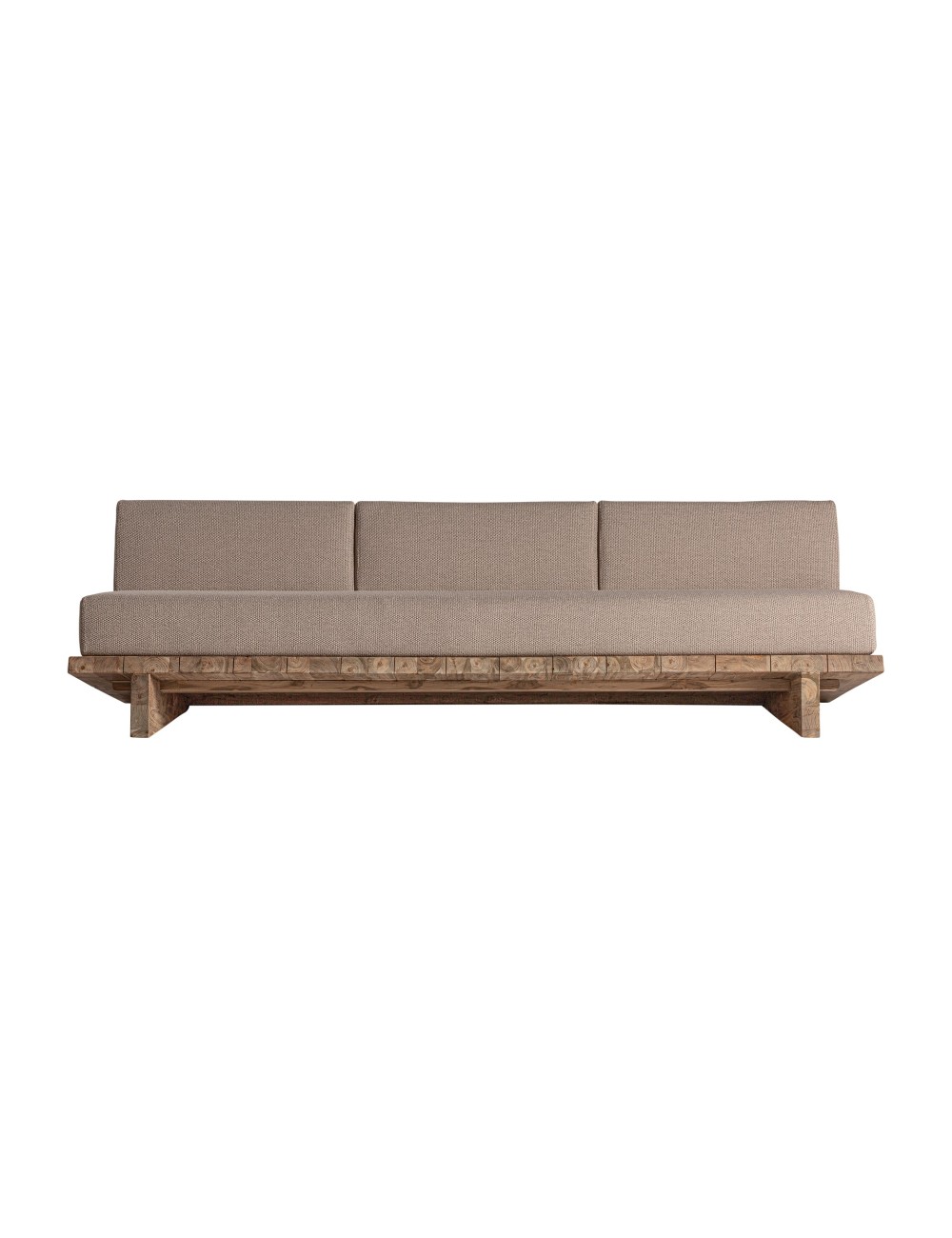 Sofá pure, en color marrón/beige natural, de estilo colonial. Fabricado en madera de teka reciclada, combinado con polipropileno reciclado y espuma. Producto desmontable, desenfundable.