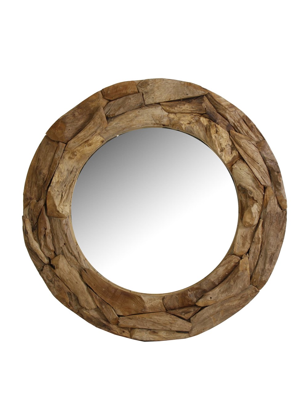 Espejo redondo tsumeb, en color natural envejecido, de estilo étnico. Fabricado en madera de teka, combinado con vidrio.