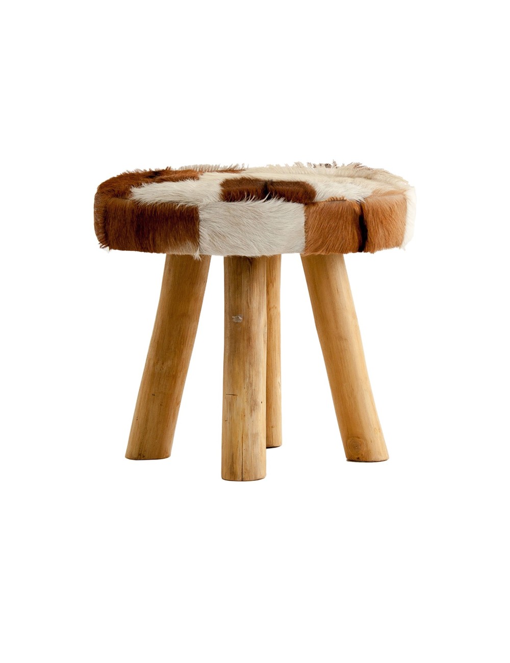 Taburete dallas, en color marrón/blanco, de estilo nórdico. Fabricado en madera de pino, combinado con piel y piel cabra.