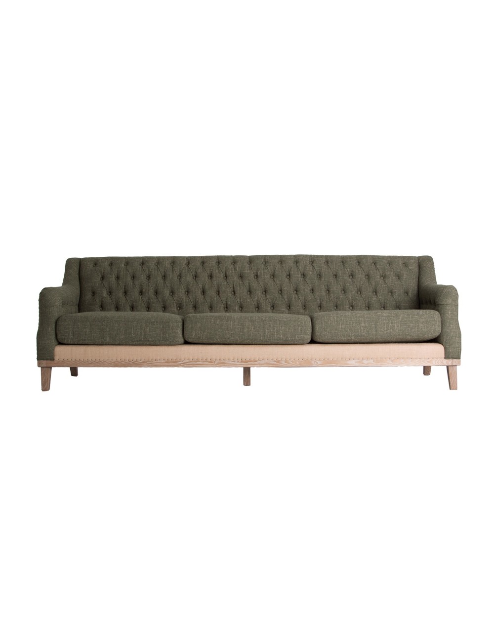 Sofá oze, en color verde, de estilo vintage. Fabricado en madera de fresno, combinado con loneta y yute.