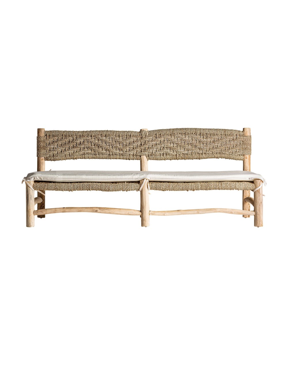 Sofá manhula, en color marrón, de estilo colonial. Fabricado en madera de teka, combinado con fibra natural y poliéster.