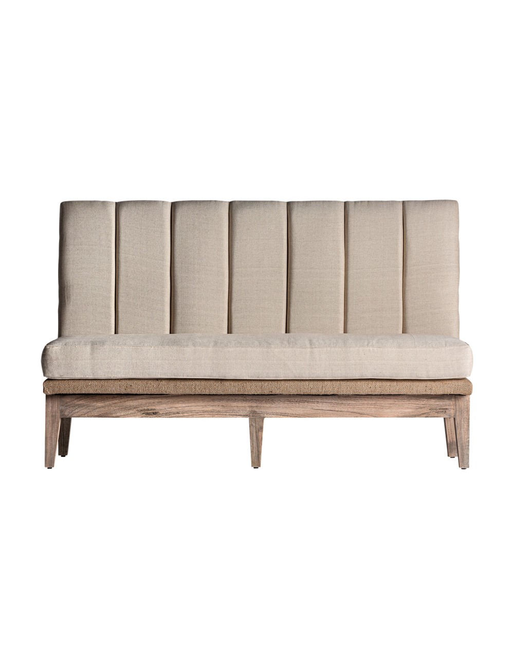 Sofá bar retz, en color blanco roto, de estilo provenzal. Fabricado en madera de teka, combinado con lino. Crea un espacio acogedor y versátil con el sofá modular Argenta. Con su diseño moderno y elegante, podrás adaptarlo a cualquier ambiente y necesidad. Disfruta de su comodidad y calidad en cada momento.