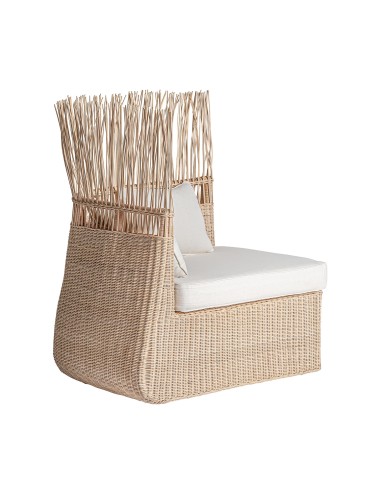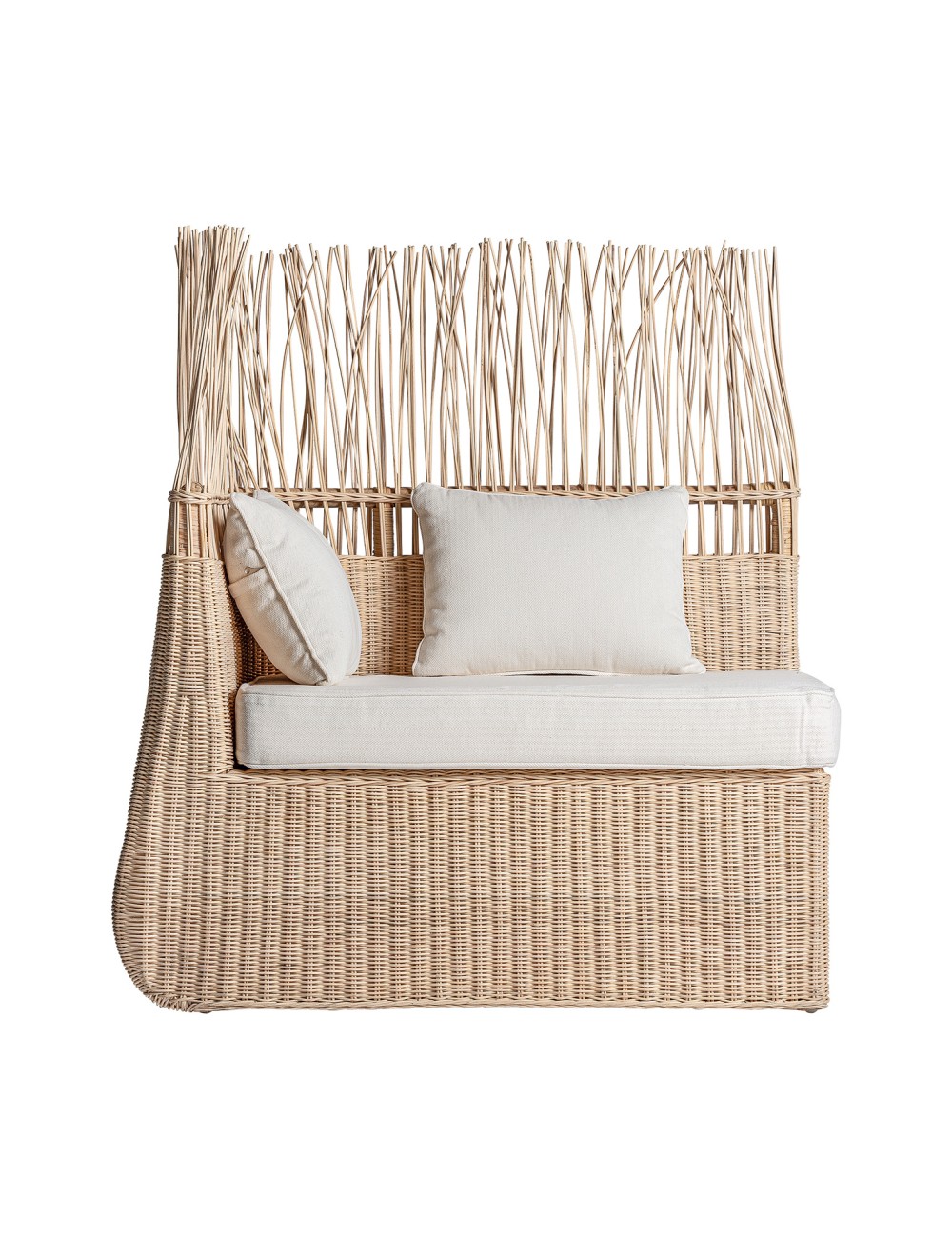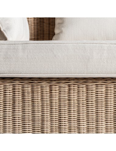 Sofá roche, en color marrón, de estilo étnico. Fabricado en ratán, combinado con algodón.