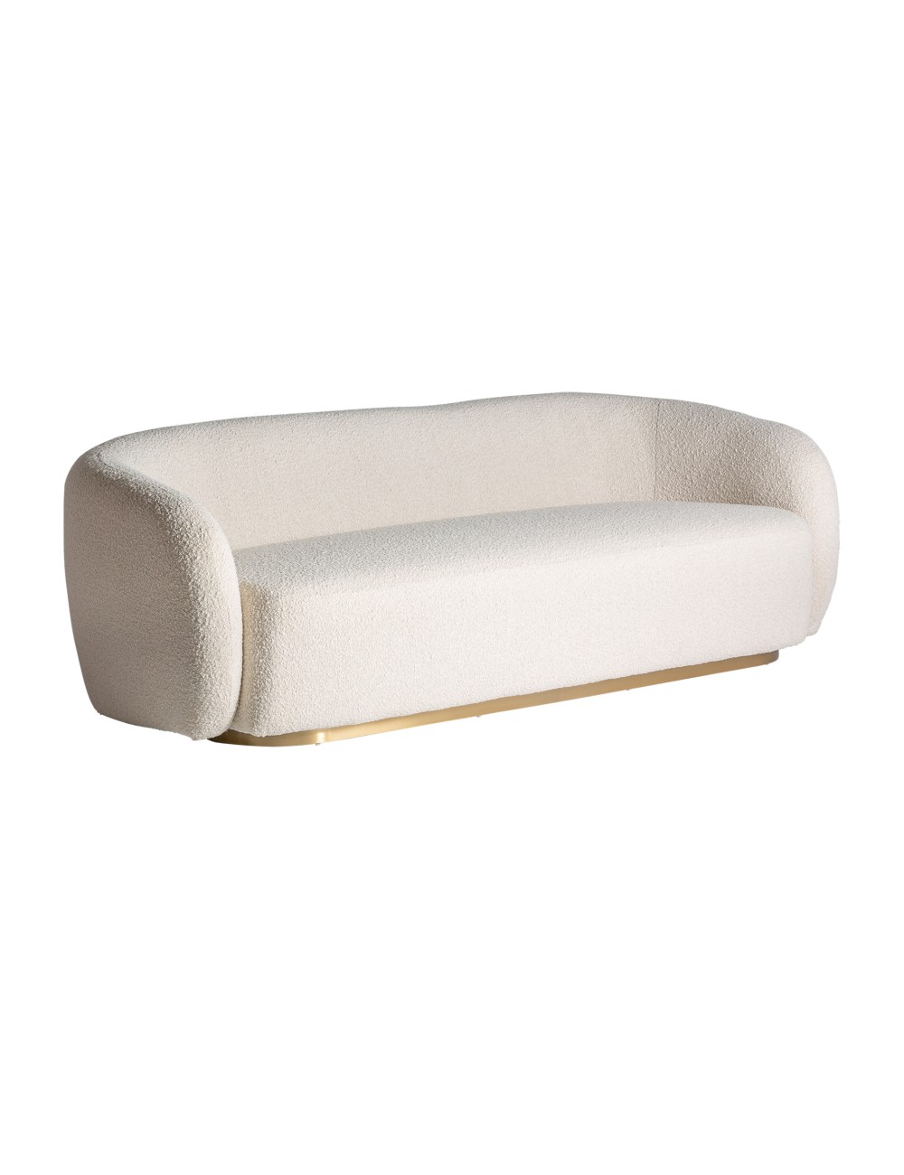 Sofá scorze bouclé, en color crema/oro, de estilo art deco. Fabricado en acrílico, combinado con algodón bouclé y madera de pino. Acero inoxidable. Sofá gacé, en color blanco, de estilo art deco. Fabricado en acero, combinado con madera de pino y algodón bouclé.