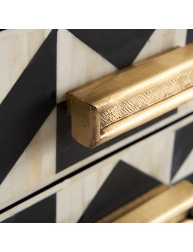 Mesita de noche senj, en color negro/blanco, de estilo art deco. Fabricado en hierro, combinado con hueso. | Mesita de noche gatsby, en color negro/blanco/oro, de estilo art deco. Fabricado en madera dm, combinado con hueso y hierro. | Mesita de noche hopfing, en color negro/oro mate, de estilo art deco. Fabricado en acero, combinado con cristal. |