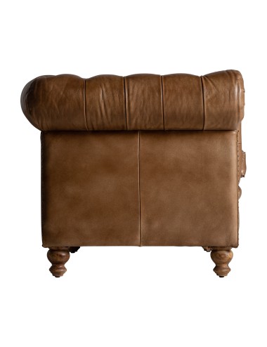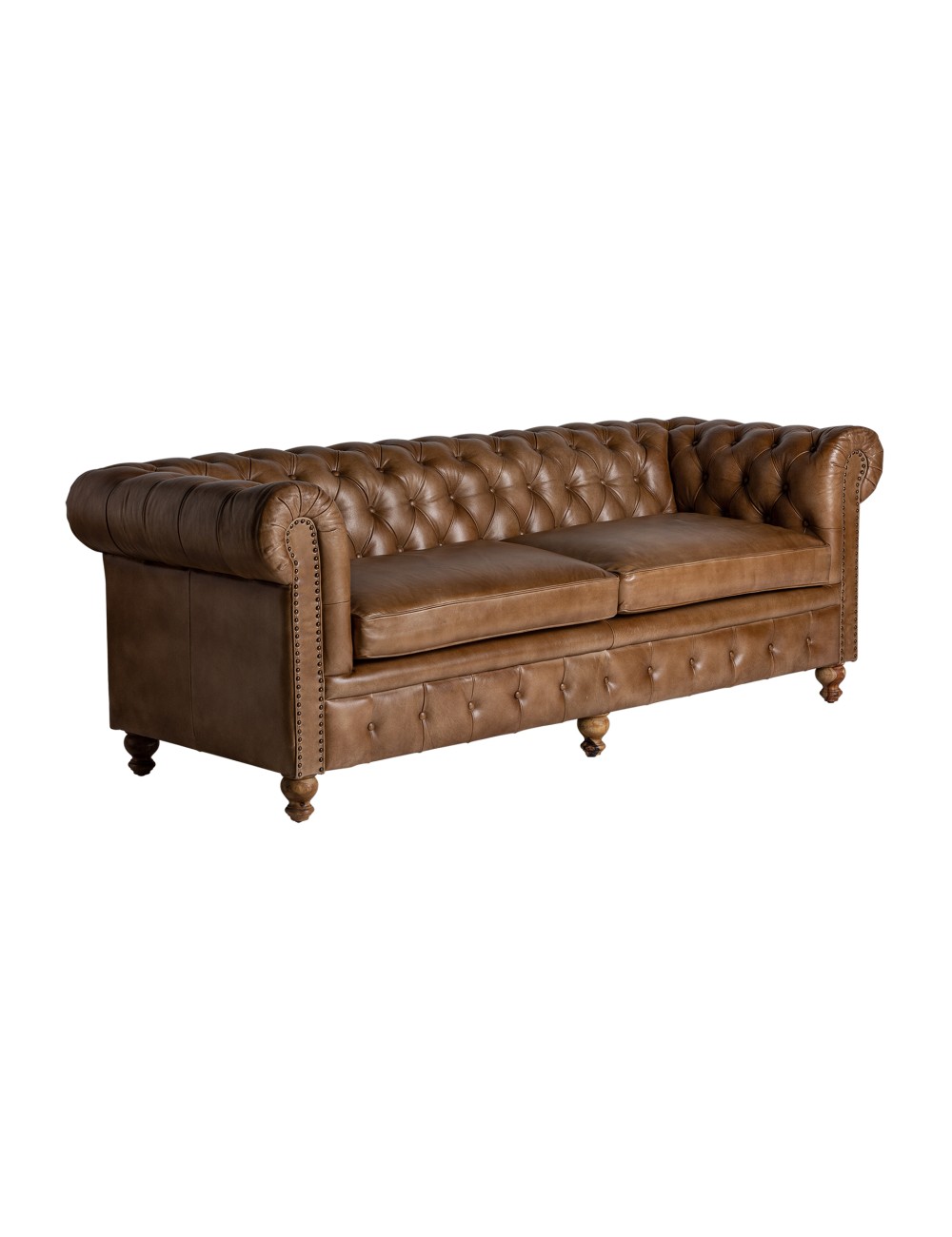 Sofá capitoné elkins, en color marrón, de estilo vintage. Fabricado en piel, combinado con madera de pino. Producto desmontable.