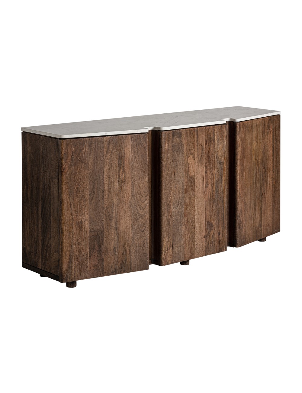 Aparador konz, en color marrón, de estilo contemporáneo. Fabricado en madera de mango, combinado con mármol. Producto desmontable.